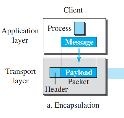 Ans: To send a message from one process to another, the transport-layer protocol encapsulates and decapsulates messages. Encapsulation happens at the sender site. When a process has a message to send, it passes the message to the transport layer along with a pair of socket addresses and some other pieces of information, which depend on the transport-layer protocol. The transport layer receives the data and adds the transport-layer header. The packets at the transport layer in the Internet are called user datagrams, segments, or packets, depending on what transport-layer protocol we use. In general discussion, we refer to transport-layer payloads as packets1.