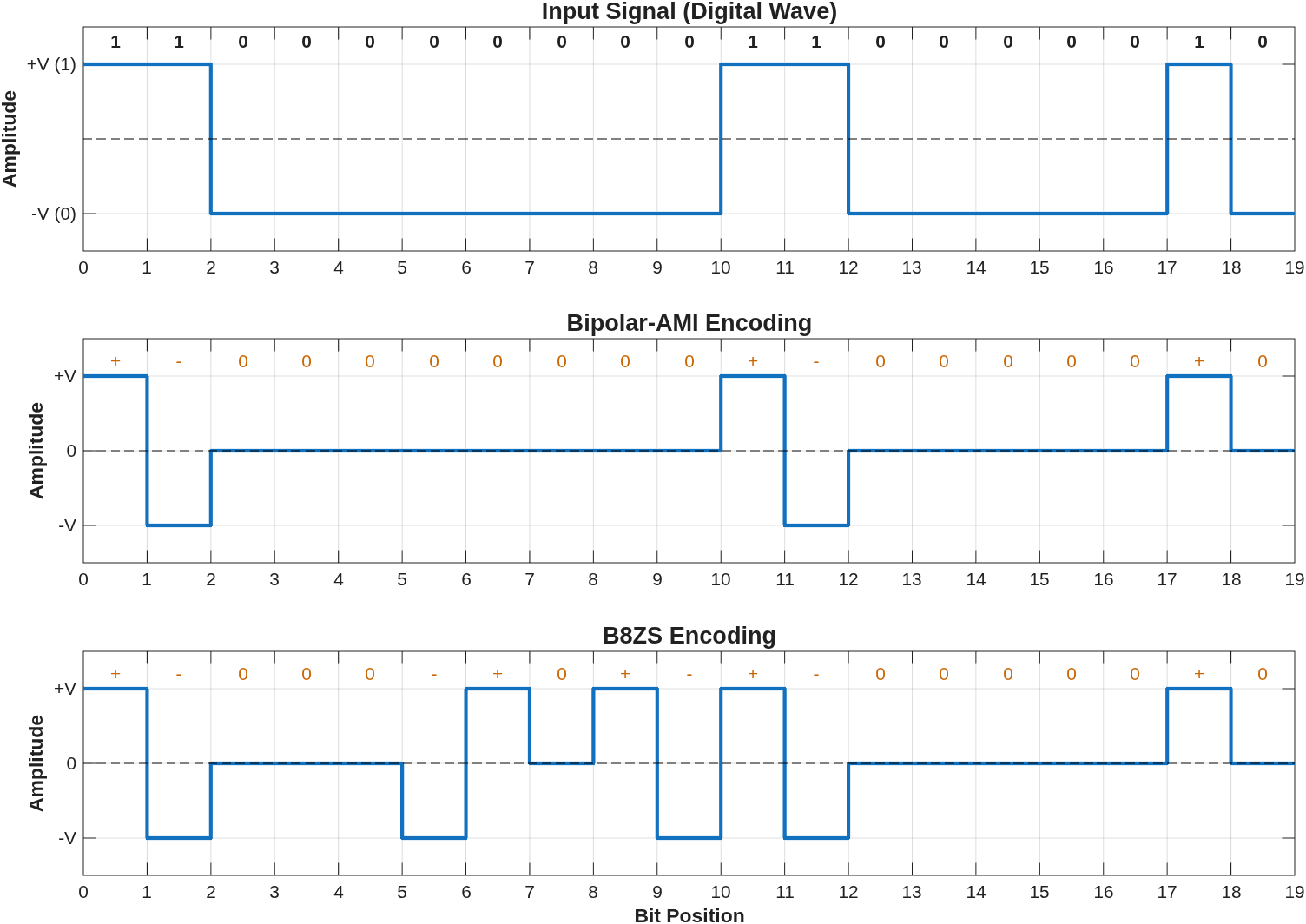 - Bipolar-AMI (most recent preceding 1 bit has negative edge).