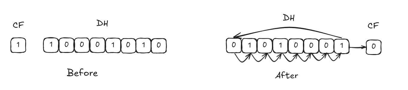 Thus, after the execution of the instruction, DH holds 51H = 01010001B and CF holds 0.
