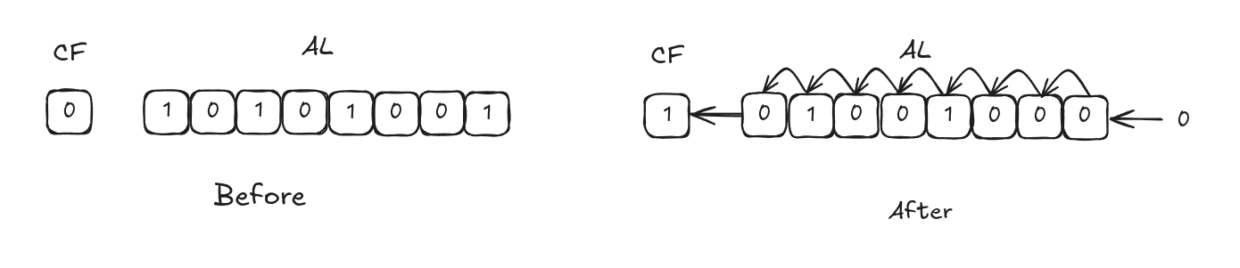 SHL destination, CL ; CL contains the number of shiftsA 0 is shifted into the rightmost bit position and the MSB is shifted into CF. Multiplies the value by 2 in each shift.