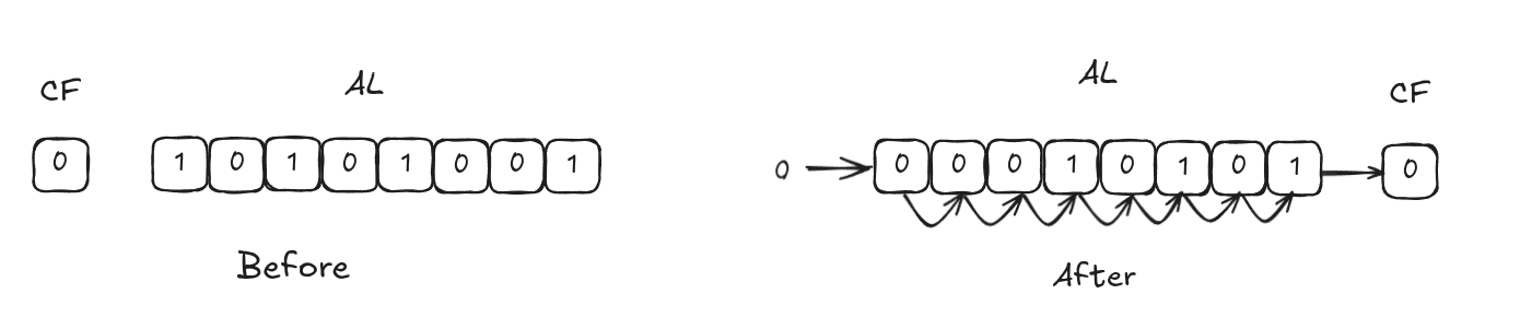 SHR destination, CL ; CL contains the number of shiftsA 0 is shifted into the MSB position and the rightmost is shifted into CF. Divides the value by 2 in each shift.